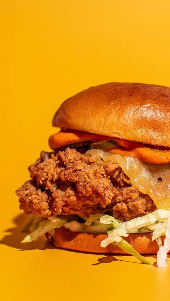 /Chiken burger with cheddar, lettuce, tomatoe, pickles, fries and sauces/